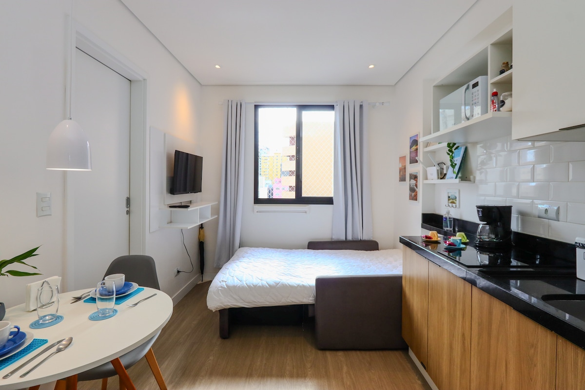 Modern studio, in the Civic Center — ideal for those looking for comfort, practicality and an excellent location in Curitiba. Air-conditioned environment, equipped kitchen and Smart TV — perfect for leisure or work. 🛏️ Comfortably accommodates up to 4 people, quality bedding. • Heated pool • Gym • Sauna • Terrace • Laundry (paid) ⚠️ For use of the swimming pool, the condominium requires presentation of a medical certificate. 🚗 Parking available in the building, R$35 per night Paid via PIX to the host.