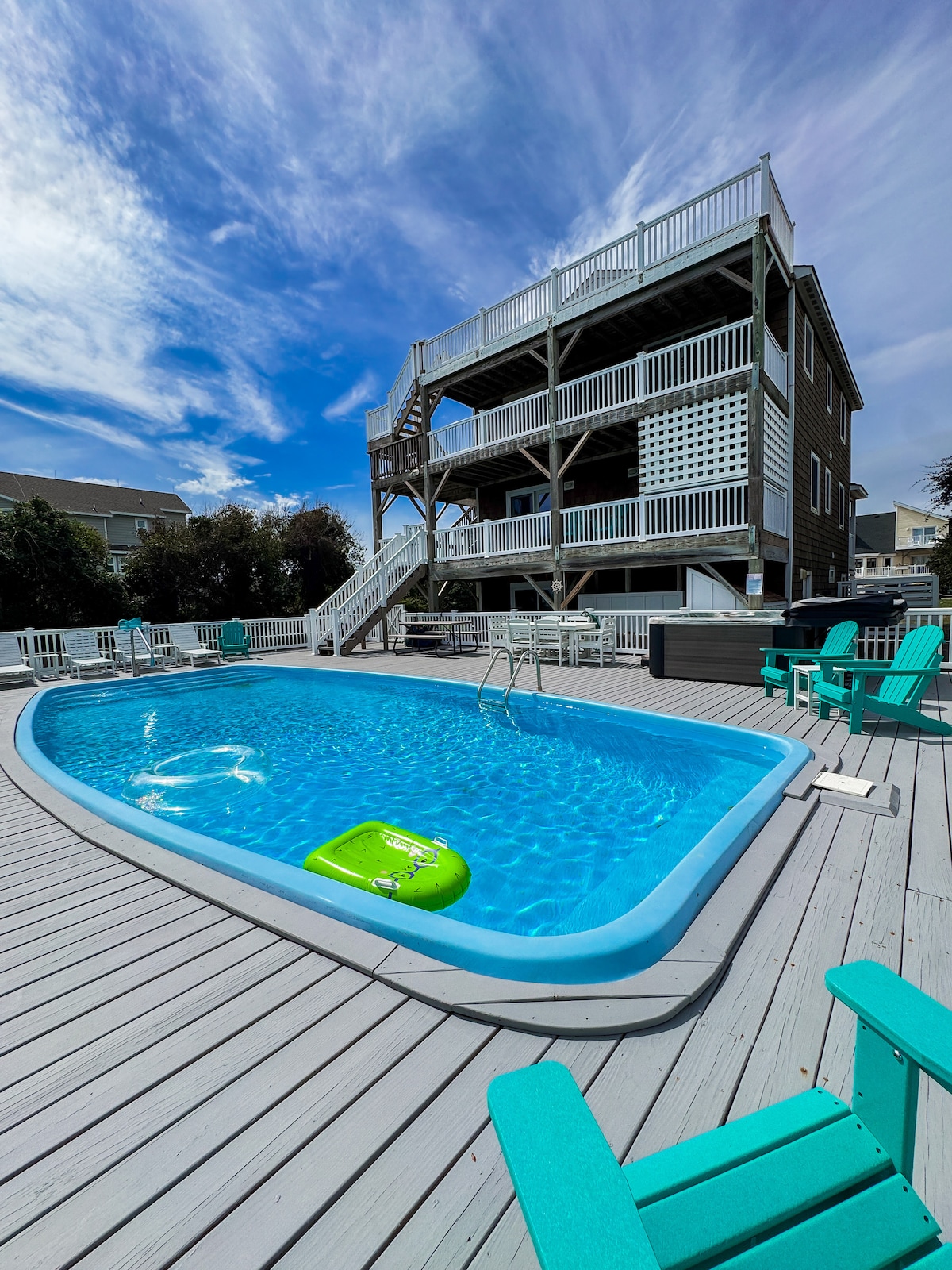 Sparkling and renovated 4 br/3 ba beach home is a 2500 ft2 tree house come to life w/ 6 decks, chef’s kitchen with open plan layout and 20’ ceilings, private pool (heat opt) with gas BBQ, screened in porch and upper hot-tub for star gazing. Spa-like bath with soaking tub and fireplace. Stunning beaches and quaint soundside sunset pier are only a short stroll or bike ride away. Conveniently located minutes from shops, restaurants and attractions while blissfully retaining the solitude of Corolla.
