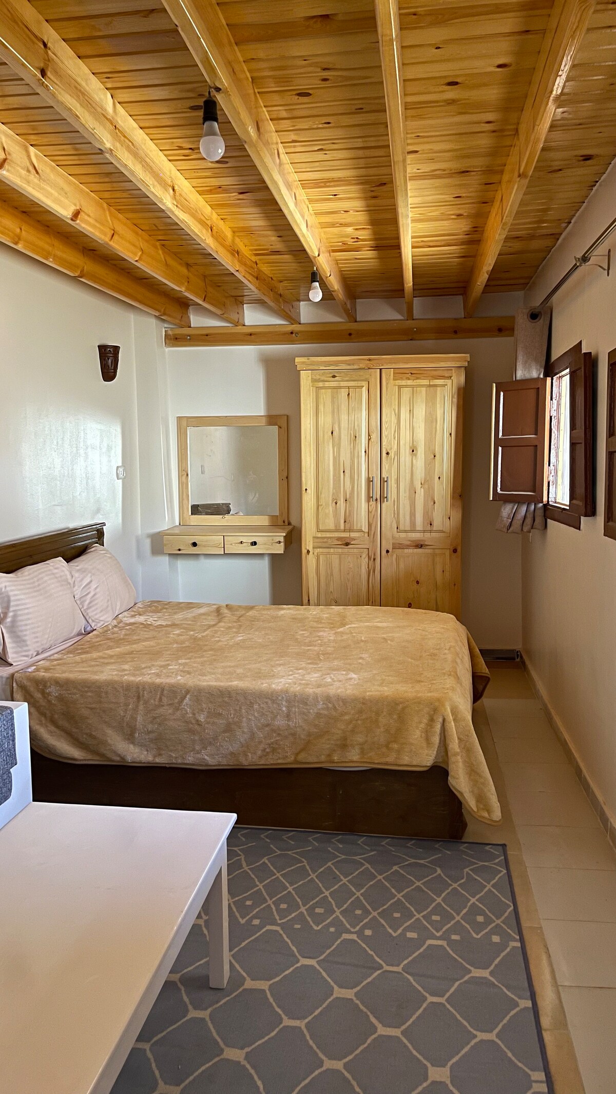 Welcome to your cozy home away from home in Dahab! Located on the first floor, the ‘Sea’-through apartment offers beautiful views of the sea through palm branches and sun rays, just as the picture shows. This spacious 1-bedroom apartment is filled with handmade furniture and accessories that reflect the organic and natural lifestyle we love in Dahab. Situated on the second line directly by the beach, it’s just a 3-minute walk to Assala market and a 10-minute walk to the Lighthouse.