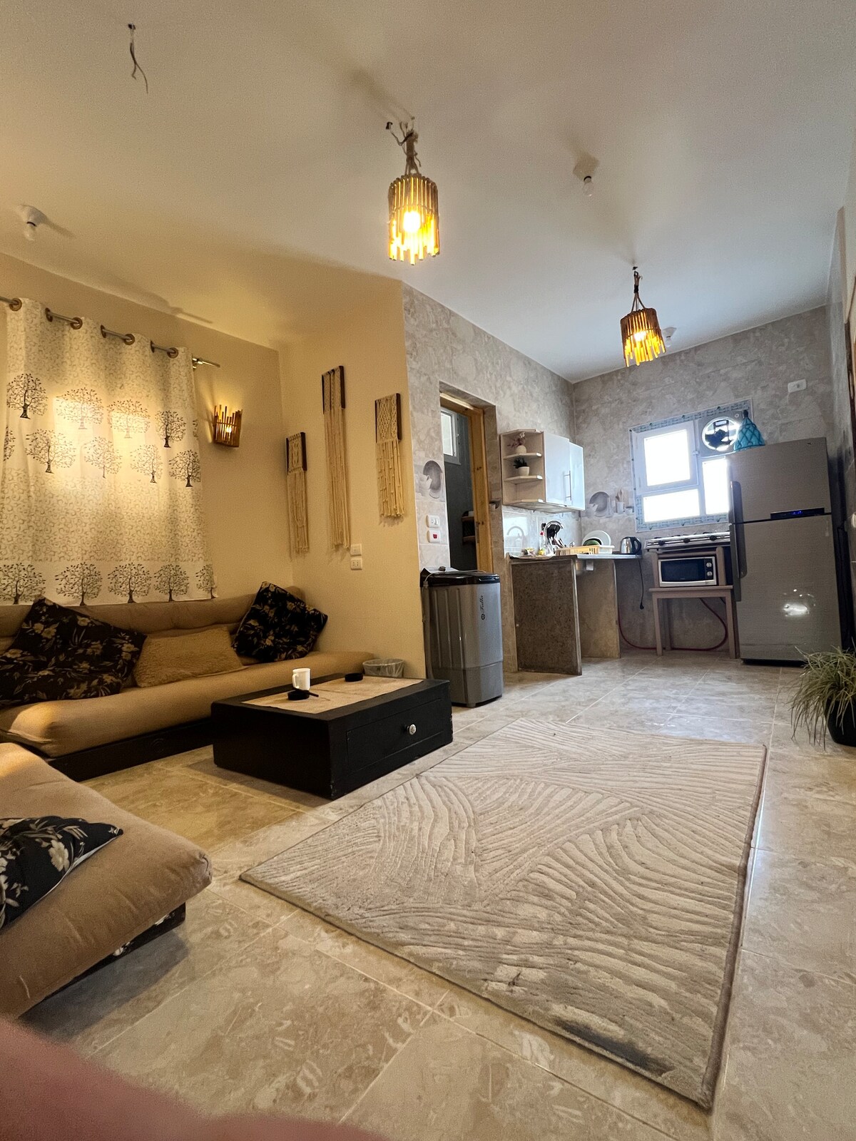 Welcome to a spacious apartment with a large terrace, open kitchen and breathtaking sea views. Here you can spend most of your time outdoors — relaxing in a cozy chill-out area, admiring the mountains, the sea and the blooming garden, in silence, without neighbors and hustle and bustle. Just a few steps away are the best restaurants in Dahab — Seduction and Shanti Café, where you will find delicious and atmospheric food. And just a minute's walk away is the most picturesque beach in Dahab. This is one of the best places to relax!