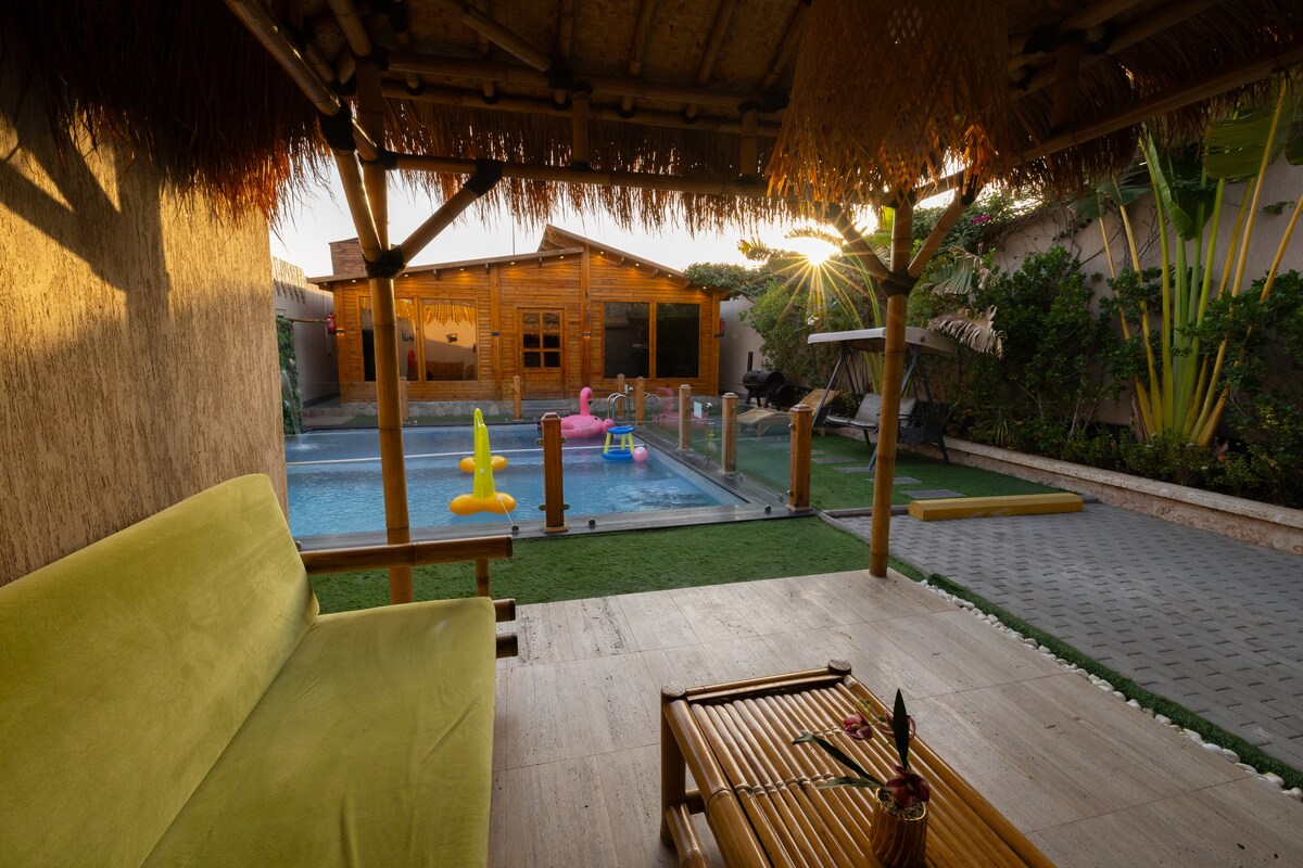 Hoping that you make a good memories with friends and family (All these in outdoor area not in main building) 1 big living room + dinning table 6 seats (service kitchen) only microwave and water heater and small fridge smart TV to watch movies 1 bed room 2 toilets 2 outdoor seats different locations Pool kayak for free You can swim either in pool or sea There is extra insurance 500sar