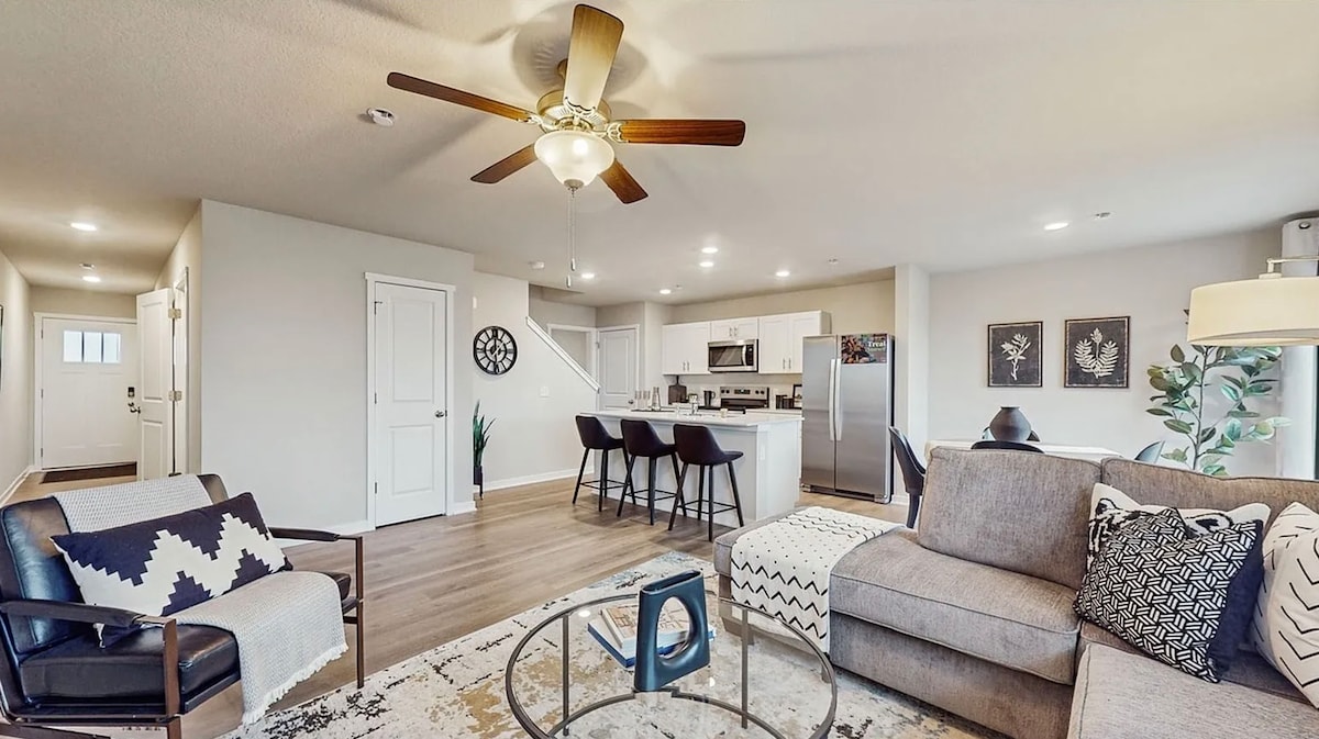 Relax with the whole family at this peaceful place to stay. This is our newest home becoming available to rent April 1st. Comfortable furnishings are now in place and feature one king, one queen, and two full beds. This is an end unit which provides great lighting & nature views! The location can’t be beat in this brand new construction neighborhood that’s safe and scenic! 5 minutes from all the best Jordan Creek West Des Moines has to offer. Valley View Aquatic Center 5 minutes away