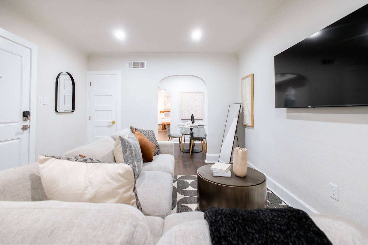 Stay in the vibrant Deep Ellum neighborhood, minutes from Downtown and Lower Greenville. This modern apartment blends comfort and style, featuring sleek decor, a cozy living space, and a fully equipped kitchen. Perfectly located near top restaurants, bars, and live music venues, it’s your gateway to Dallas’ nightlife and culture. Whether exploring the arts scene or relaxing in style, this chic urban escape is your perfect home base. Book now and experience Dallas!