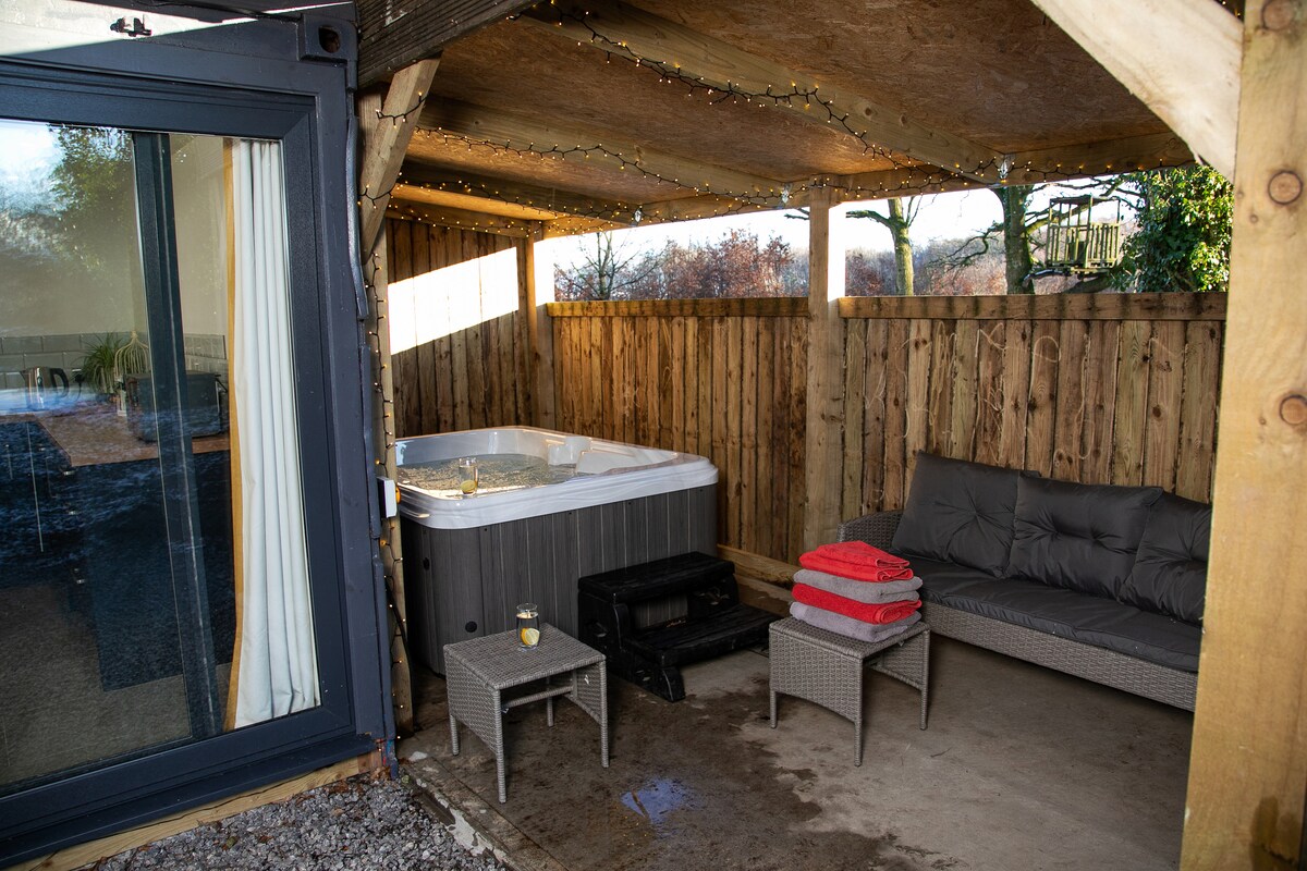 The Hide Lodge is a stylish space, designed with relaxing and retreating in mind. It is cosy and warm with underfloor heating. The open plan lounge and living area has full width bi-fold doors, which allows the space to be fully opened up to feel like part of the woodland beyond. The main bedroom boasts sliding french doors, also overlooking the woodland and stream, with a bath placed to enjoy this view. There is a private terrace and patio area to enjoy al-fresco dining or star-gazing.