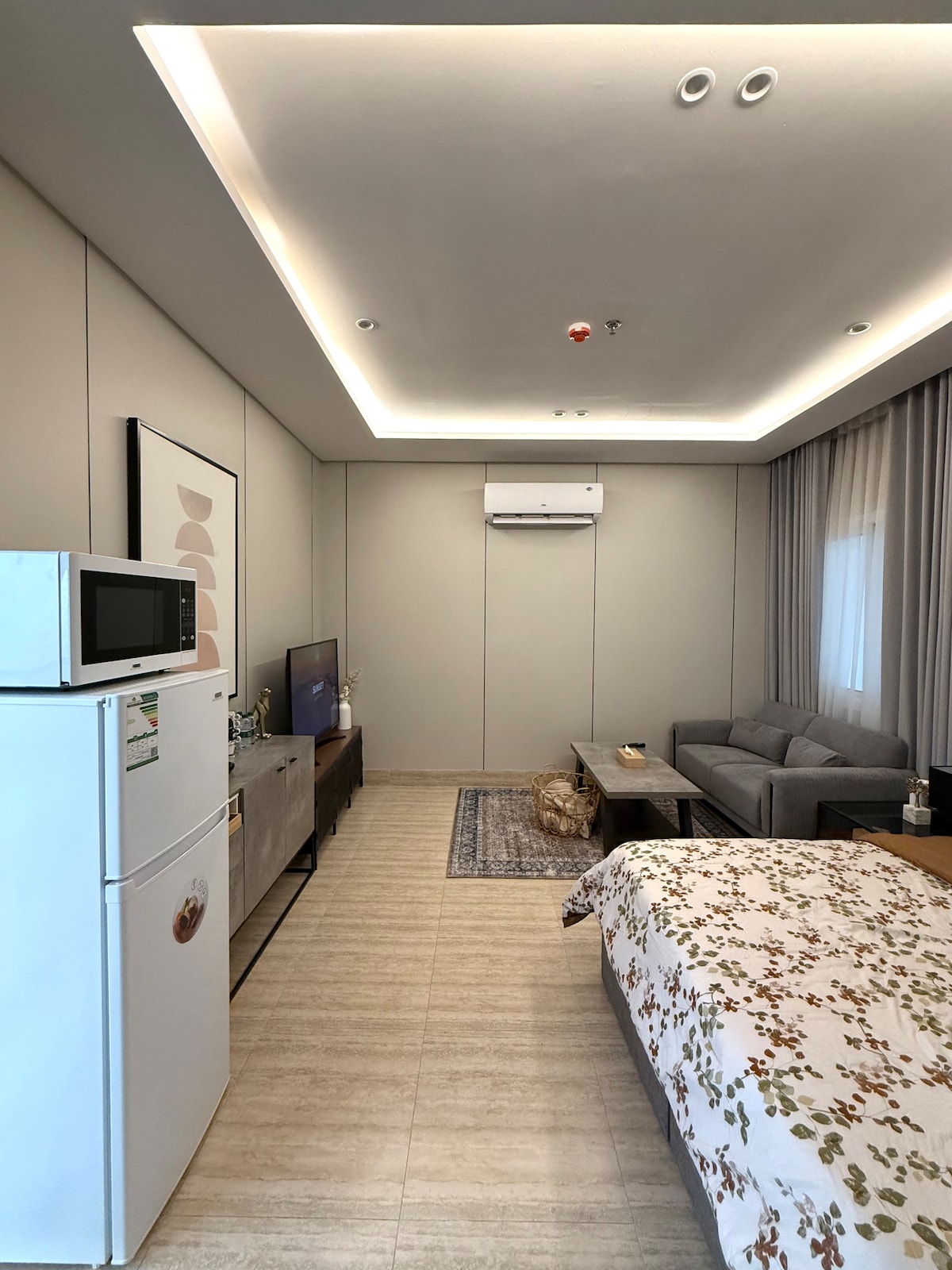 * * Premium Location 📍* * The apartment is located in a luxury residential complex, Close to a supermarket, a laundry, and a sports walkway. It is only 5 minutes from the Bahrain Bridge🇧🇭. **Comfortable and modern studio apartment with smart entry system (Self Check-in) 🔑** **Features:** - Newly furnished with classic furniture. - Equipped with an Internet connection🛜 ⚡. - Includes an integrated service corner (refrigerator, stove, microwave, kettle, and espresso machine☕️. - **Facilities:** - Has green spaces, a swimming pool (Swimming hours: 9:00 am to 6:00 pm)🌞. Enjoy a comfortable and special stay!