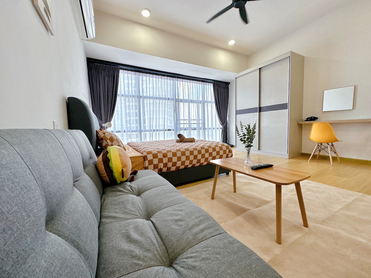 (1+1 BR & 1 bathroom) Contemporary modern and cozy condo in the heart of JB city centre. Suitable for 4pax family, friends and business group. **5mins to CIQ, City Square, KSL, Pelangi, and Larkin **8mins to Mid Valley Southkey, Larkin Sentral and Sentosa **15 mins drive to Paradigm mall, Sutera, Skudai and Mount Austin ✔ 4K SmartTV ✔ High Speed Wi-Fi, working tables with extension plug ✔ Washer ✔ Airconds in every rooms. ✔ Atari console, Mahjong, and Board games. ✔ FREE parking for 1 car