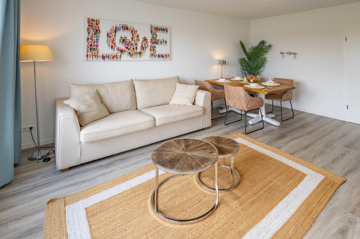 Forget your worries in this spacious and serene space. Whether privately or on business. Our accommodation offers all the amenities you could wish for. Large living-dining area with open kitchen and fireplace. A bathroom with walk-in shower, bathtub and double sink, as well as two bedrooms. The master bedroom has a height-adjustable desk for creative work. The 15 square meter balcony offers wonderful views of the countryside.
