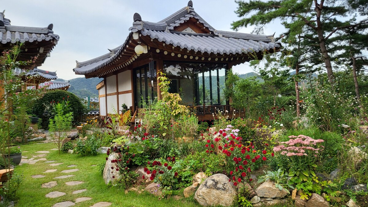☆☆ In spring, you can take a walk with your family in the garden full of flowers, in summer, you can use the outdoor children's swimming pool alone without cost, with the sound of refreshing water flowing in the valley, and in autumn, you can enjoy the cool breeze and colorful leaves blowing from the valley. In winter, you can roast sweet potato nights on a campfire, and you can use a barbecue grill that can be used without cost. When it snows, walk down the path with your friends. ☆☆ The 76m2 eco-friendly wooden house is fully equipped with amenities.In the hot summer, there are 2 air conditioners and fans in the living room and bedroom, and a Duratex cooling pad is also prepared on the bed. In addition, we prepared a Kuchen rice cooker and rice in the refrigerator so that you don't have to buy a half-cooked rice. Please come and prepare food at any time and spend a comfortable healing time. ☆☆ There are Hwayang Valley, Seolunsan, Gongrimsa, and Sanmagi Old Road in the nearby streets, and there are Nonghyup, a large supermarket, Cheongcheon Traditional Market, a forest cafe, and a restaurant where you can have a delicious meal within 5 minutes.
