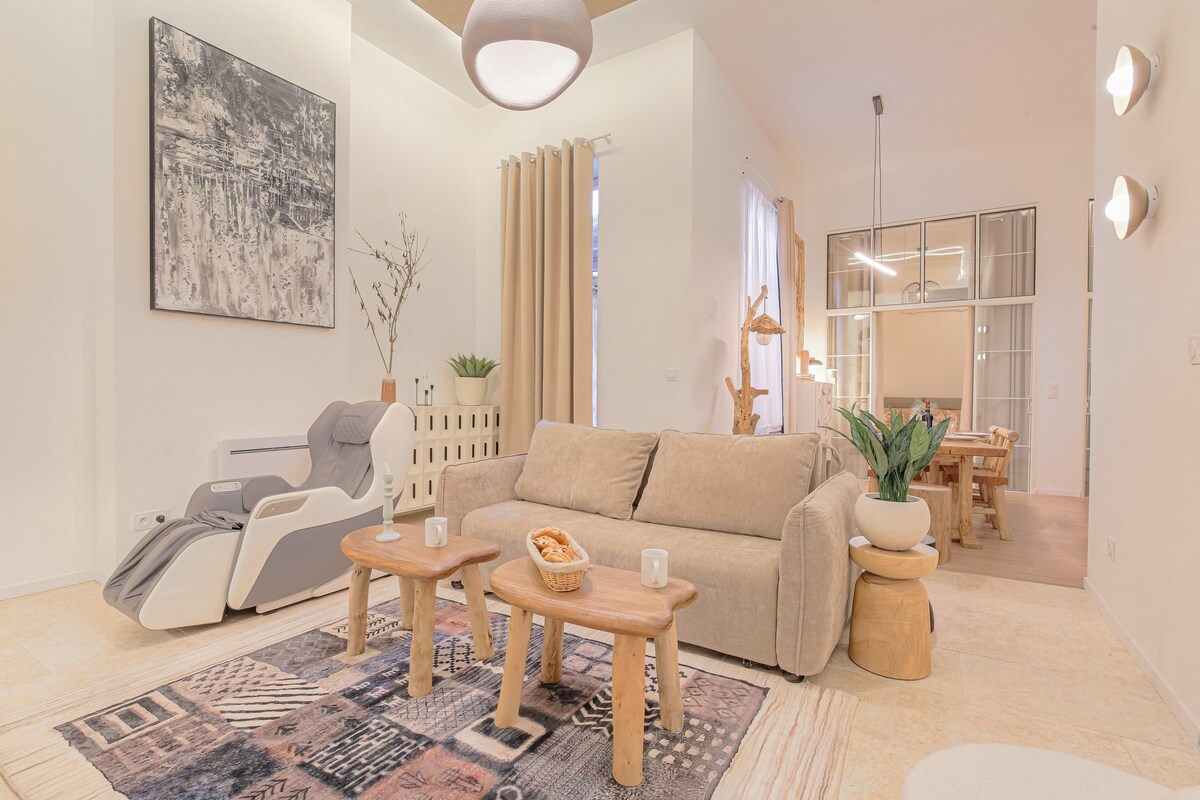 The dressing room is a penthouse apartment, rooftop with upscale amenities. You can enjoy 60m2 for up to 3 people (the third bed is an extra, 1-person sofa bed from Maison du Monde). The lodge is the perfect combination of comfort and tradition: exposed woodwork, air conditioning, fiber optic and TV channels, fully equipped kitchen, chosen decoration, exhibition of works of art, terrace, balcony, private parking for an additional fee.