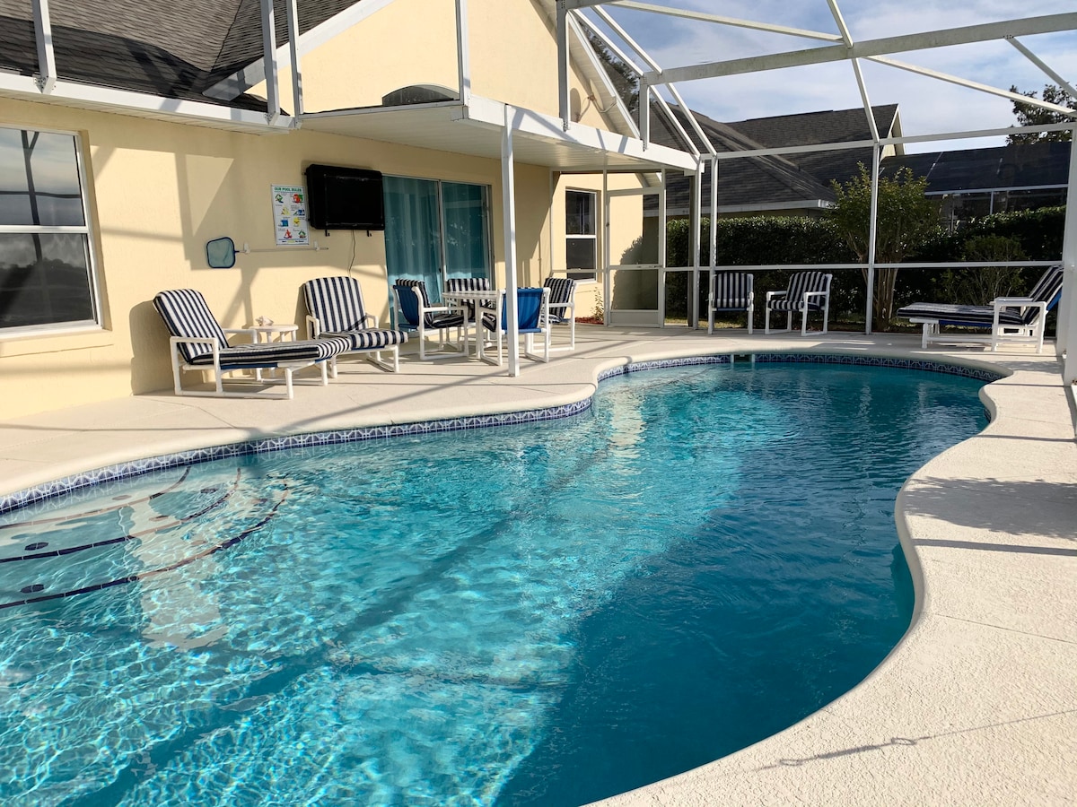 Relax with the whole family at this peaceful HEATED POOL house in Davenport, just miles from Disney World Theme Parks, Universal Studios and Legoland in Orlando Florida. Master Suite has sliding doors and great view to screened Pool & Lanai. 3 bedrooms, 2 bathrooms, fully equipped kitchen, 3 Smart LED TV's and strong Wi-Fi all around the house. Enjoy our Games Room with Indoor Basketball and Pool Table located in the garage! Parking is in the driveway.