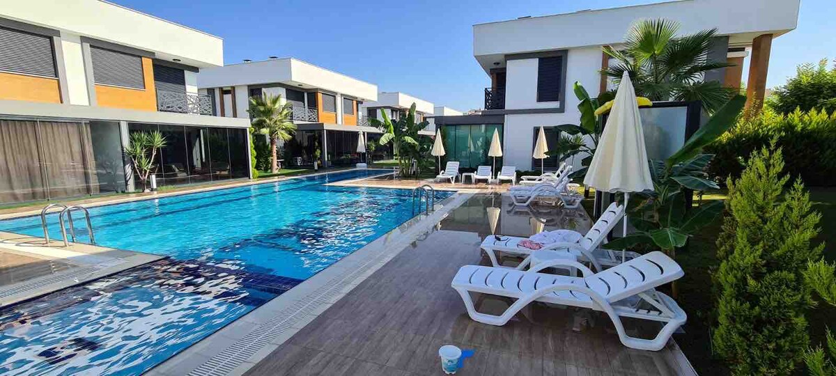 4 villas with private pools, 1500 m from the sea, REGISTERED WITH THE MINISTRY OF TOURISM in Kuşadası. 300 m2. In the garden, surrounded, private outdoor parking, barbecue, sunbed, garden table and chair set, fireplace, 4 bedrooms (each with double bed), 1 living room, newly furnished, all white goods and furniture, built-in kitchen, all kitchen equipment (tea maker, plates, cutlery, pots, etc.) air conditioning in the living room and rooms, 24-hour hot water, hair dryer, iron, shopping mall/market within walking distance