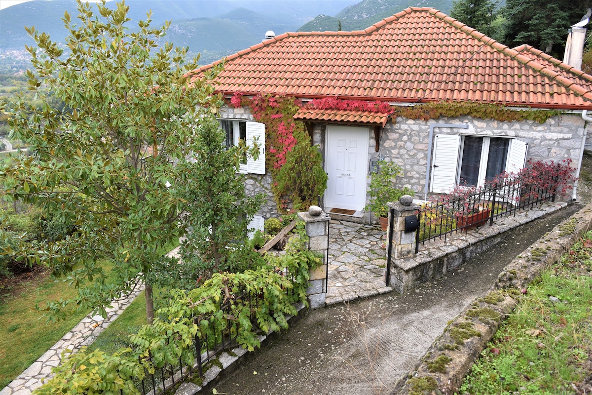 there is a living room with a corner couch that is easily transformed into a bed, situated in front of the fireplace that creates a warm and cozy atmosphere in the cold winter nights. The living room has a magnificent view to the lush garden. The open, built in kitchen has a table for four persons, is fully equipped with settings and all the necessary kitchenware and has a spacious refrigerator, a washing machine, an electric oven and four (4) ceramic hobs. The bedroom is located above the bathroom and the entrance hallway. It has a queen-size bed and a big built in closet and offers a view to the garden. When you open the main French window of the living room, you step out in a beautifully organized paved area with lawn and tall trees that offer complete privacy. In the garden, there is a table that can accommodate ten (10) persons, inviting you to enjoy a coffee, lunch or dinner with the company of friends any time of the day, with a view to the lush garden.