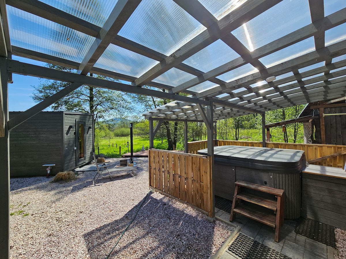 Welcome to our cozy wooden igloo. Relax in the amazing sauna and enjoy the terrace with a grill. There are other igloos nearby, 120m away. All igloos have air conditioning. They are located in the picturesque Bohemian Uplands, near the Pravčická brána, Tiské skály and other beauties. Immerse yourself in the silence of nature, find peace and quiet. Watch the sheep grazing nearby. Your stay helps us to bring life back to the romantic ruins of the Skrytín chateau.