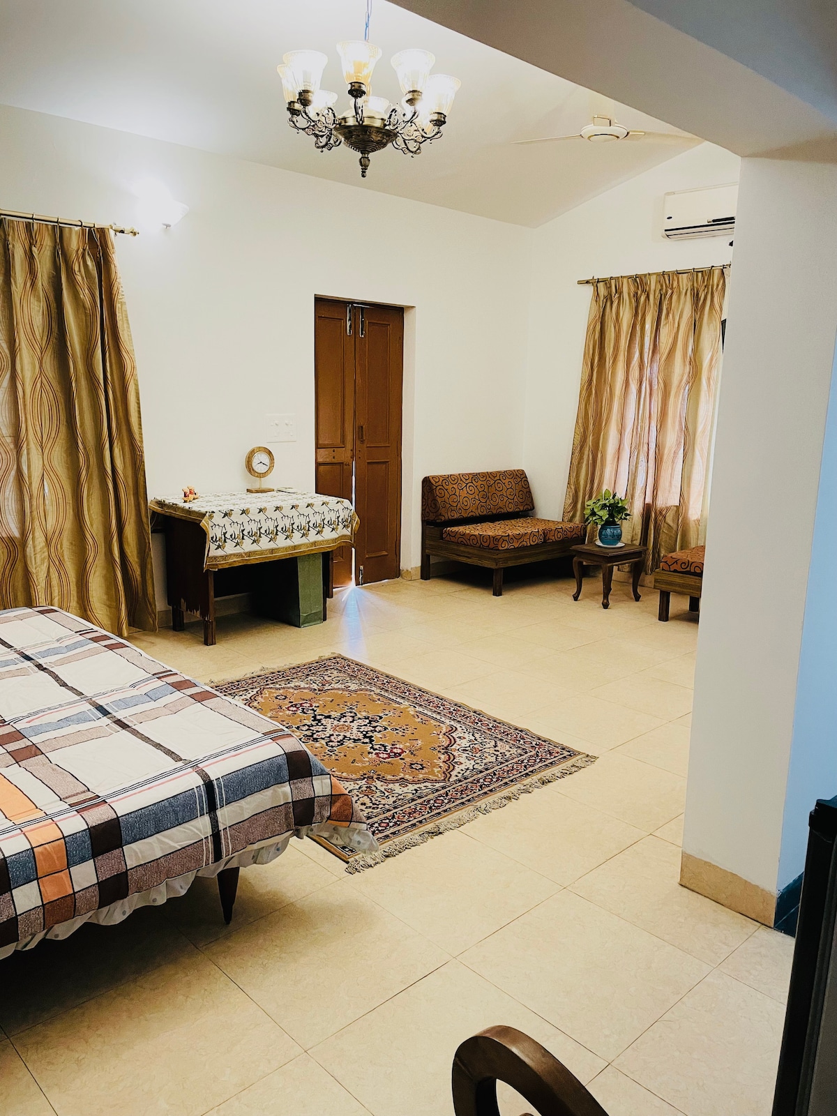Discover our elegant fully serviced Studio Apartment in Dehradun! Featuring a cozy bedroom + sitting area, free Wi-Fi, AC, TV, and a private bathrooms. Work comfortably at a dedicated workstation in a space with high ceilings, large windows, 2 private balconies. Experience a fully equipped kitchen along with essential comforts such as a First Aid Kit, fire extinguisher, free parking, seamless self-check-in, board games, hair dryer and iron, etc