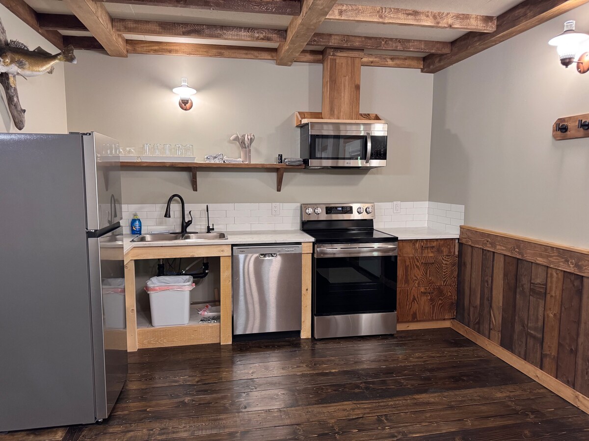The Backwoods cabin is a new 2 bedroom cabin with a full bathroom and full kitchen. It features a queen bed in each bedroom along with a sofa bed in the living room. Enjoy your coffee out in the screened in porch overlooking Cowan Lake. This one is next to the resort laundry/washrooms for quick access to the coin-op laundry or extra washrooms. For larger groups, book The Train Station as these two are connected with the screened in porch!
