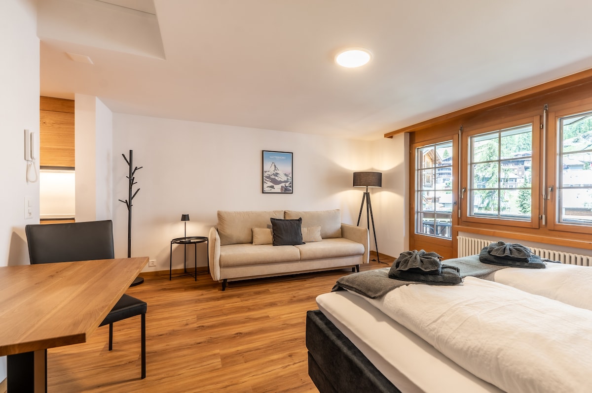 Our renovated studio is centrally located, 5-10 minutes' walk from Zermatt train station. Climbing the stairs to the house (90 steps) is always worth it, because the accommodation is characterized by a lot of brightness and a view of the village. In addition to a fully equipped kitchen, the apartment is equipped with a bathtub, a cozy sitting area and a 1.80 m bed. A TV with Apple TV box and free Wi-Fi are available, as well as a lockable ski storage room.