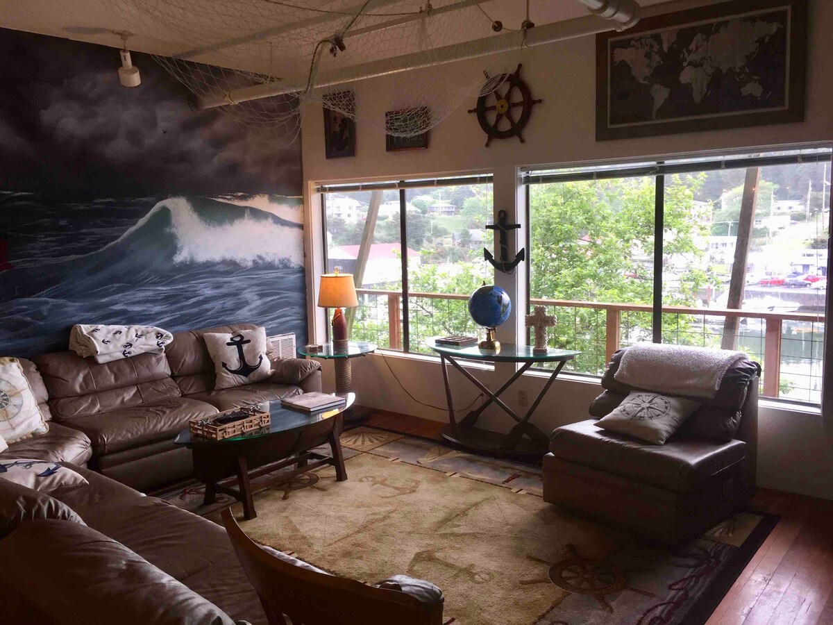Thematic Beach House that overlooks Depoe Bay Harbor & Marina! Steps away from the ocean, shops, and restaurants with the best Whale Watching in Oregon! There are beds for 5 but can sleep up to 10 guests(including infants). $15 per person, per night over 5 people. Please note, Depoe Bay charges a local tax of 12% that is not collected when you make your reservation. This tax will be requested from you, via email from the Airbnb resolution center and must be completed prior to your arrival date