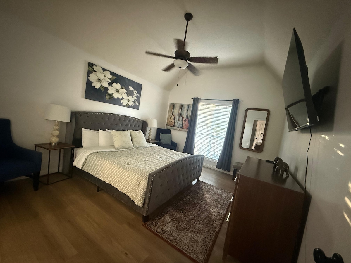 The Space • Smart TVs in the living room and owner suite • Enclosed backyard with patio set • Fully stocked kitchen • Smart washer and dryer • Central AC and heating • 2-car garage plus driveway parking • Keyless entry • Super-fast WiFi • Dedicated workspace Sleeping Arrangements • King bed in owner suite • Queen beds in other bedrooms Additional Features • Owner suite with soaking tub and shower • Dining room • Reclining couch • Exterior security system