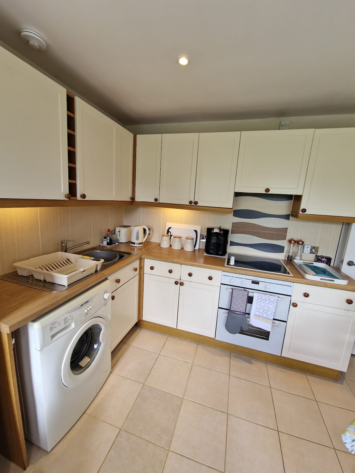 The Lodge itself is large and extremely well equipped. It caters for 6 plus a well behaved dog. There are three bedrooms comprising one main double room and two twins and one en-suite shower room to the double and one family bathroom with bath and shower. The Lodge is extremely light and has some wood ceilings throughout. The kitchen is fully equipped with a dishwasher, slow cooker, and microwave. Two ovens and a gas hob are also there for the chefs.