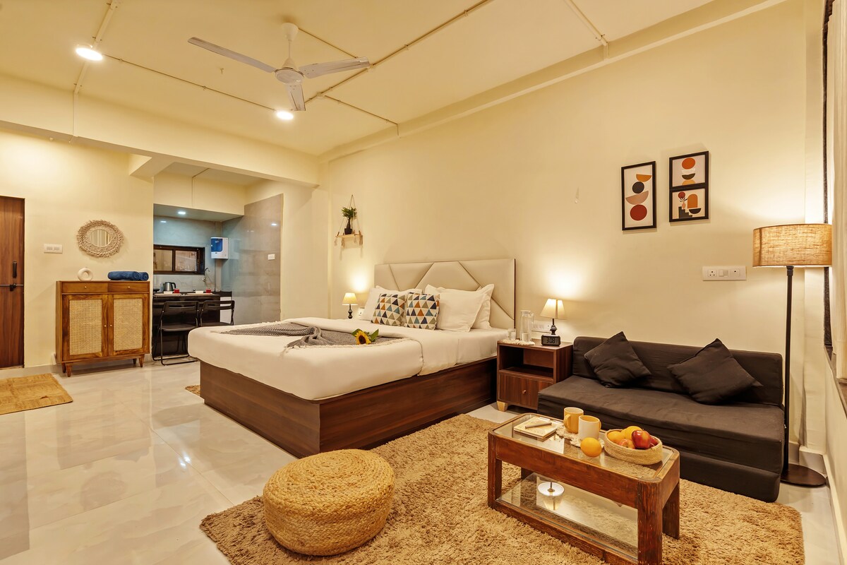White Lotus Highway Den | Balcony Views & Peaceful Studio Wake up to mountain views and fresh highway breeze 🌿 A calm, compact studio with a balcony and kitchenette — ideal for travellers, couples & remote workers. ⸻ 🌿 Perfect For Couples, solo travellers, digital nomads, or anyone driving between Pune, Satara, Kolhapur or Bangalore looking for a peaceful overnight stop instead of a hotel.