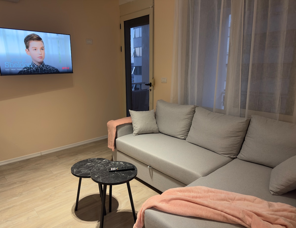 Lovely apartment (a bedroom and a living room plus kitchen area) on the 10-th floor of a new building,, located just minutes away from the New Boulevard and very close to the National Sport Park, Tirana. Major attractions are 15-20 minutes walking distance from the apartment, such as Pazari i Ri (The New Bazaar), Skanderbeg Square and Bunkart 2.