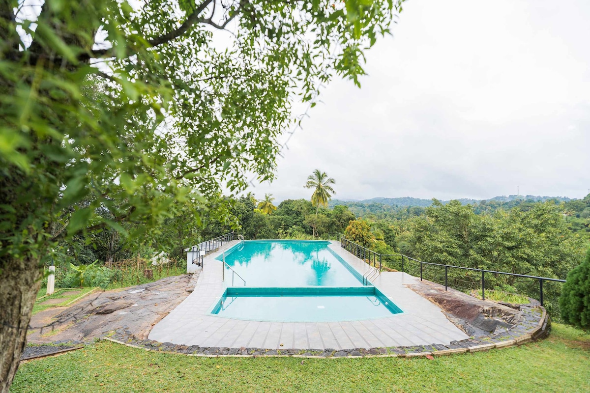 An absolute relaxation on a mountain top with a panoramic view of mountain range and stunning sunset. It's just 5km away from the Peradeniya railway station. ideal location to have a dip in the pool enjoying beautiful sunset. Specious rooms with attachec bathrooms overlooking breathtaking view.