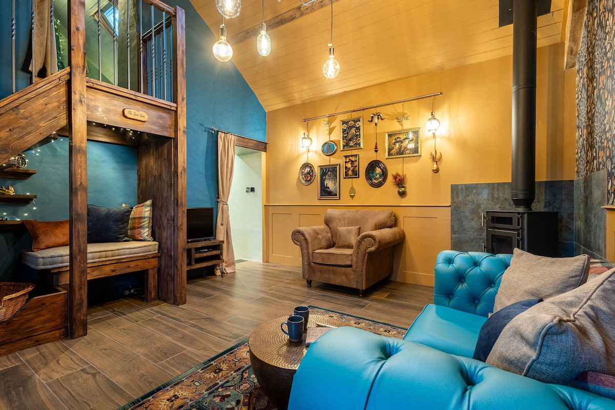 A real gem of a place! Beautifully crafted, simple cosy interior, nice comfortable kingsize bed, shelves, oak table, comfy seating & a wood-burner. There are electric sockets, a kettle, kitchen utensils, lamps & fixed lanterns for lighting in the evenings. Enjoy the balcony looking out eastward towards the sunrise hills with a table and chairs to enjoy your breakfast & a small evening lawn around the back. To the right, is a newly built kitchen area with a gas hob, running water, & drying area.
