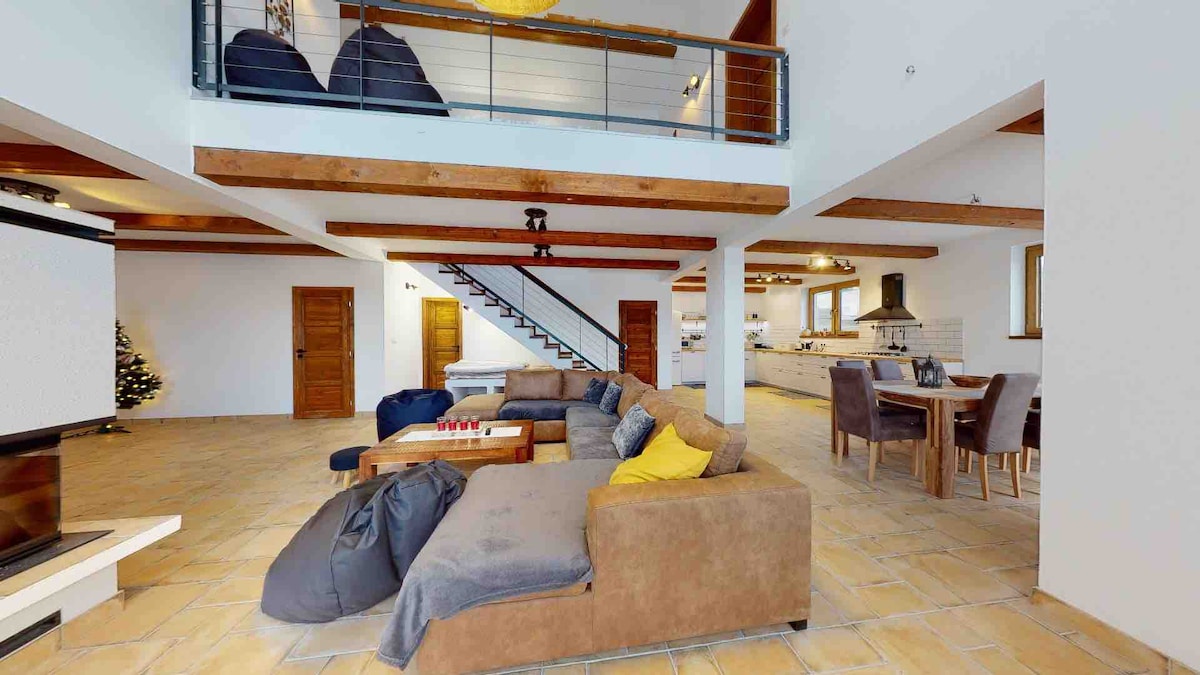 Humno is a wooden building in a loft design. Authentic wooden walls and beams are complemented by a distinctive architectural element, the "cube", which is a perfect symbol of modernity. On the left is a kitchen with an electric stove, dishwasher and oven. On the right, there is a bathroom with a toilet. The center of the cube is designed as a mini office with a bed and a bedroom was created on top, which is also a transition to a relaxing, climbing net at a height of 3.5 m. Outside, a large terrace was created, in which a heating tub is also embedded.