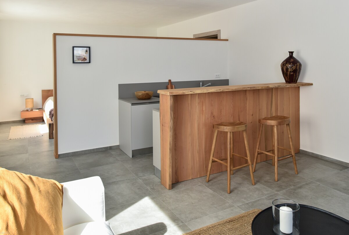 Apartment 3 mit nur wenigen Schritten zum hauseigenen Infinity-Pool und einer wunderschönen Terrasse. Ideal für Familien oder Pärchen mit Kindern. Unser Apartment verfügt über ein stilvoll eingerichtetes 2 Schlafzimmer mit komfortablem Doppelbett, welches Ihnen eine erholsame Nachtruhe garantiert. Das Wohnzimmer ist mit einer ausziehbaren Couch ausgestattet, die zusätzlichen Schlafplatz für 2 Gäste bietet.