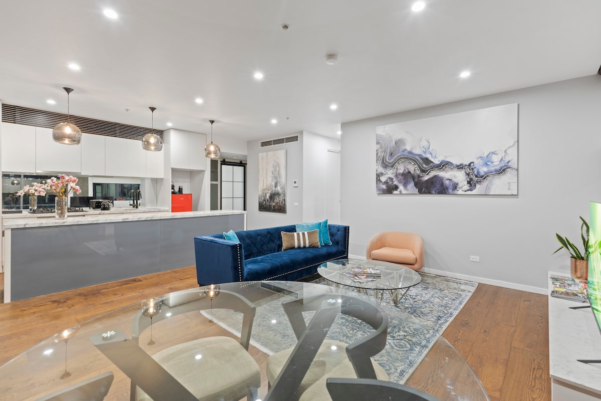 Step inside to be greeted by an open-plan living area adorned with stylish wood furnishings and industrial accents. High ceilings and large windows flood the space with natural light, creating a warm & inviting atmosphere. Wander outside to our big balcony with ample space for family to mingle. The District shopping center is just a stone's throw away, offering supermarkets, restaurants, retail and entertainment. Frequent tram service just downstairs connects you to the rest of the vibrant CBD.