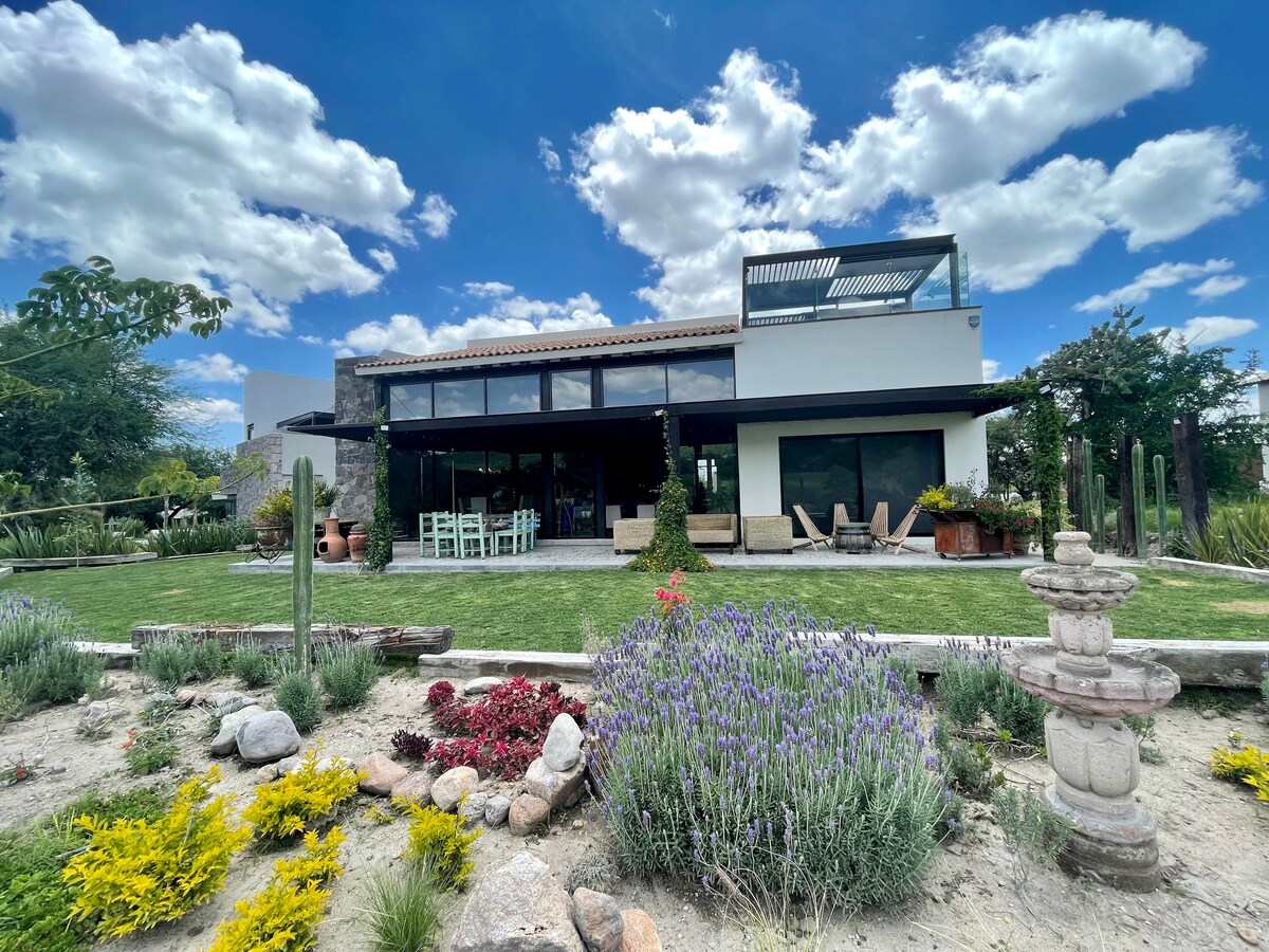 This house is great for a weekend with friends. It has everything you need. Terrace, rooftop, Jacuzzi for 10, barbecue, fire pit, 3 dining rooms, 2 kitchens, 6 bedrooms and 6 full bathrooms, air conditioning and heating. It is located in the Ventanas Golf Club, 8 minutes from the San Miguel de Allende Cathedral. The house includes daily housekeeping like a hotel.