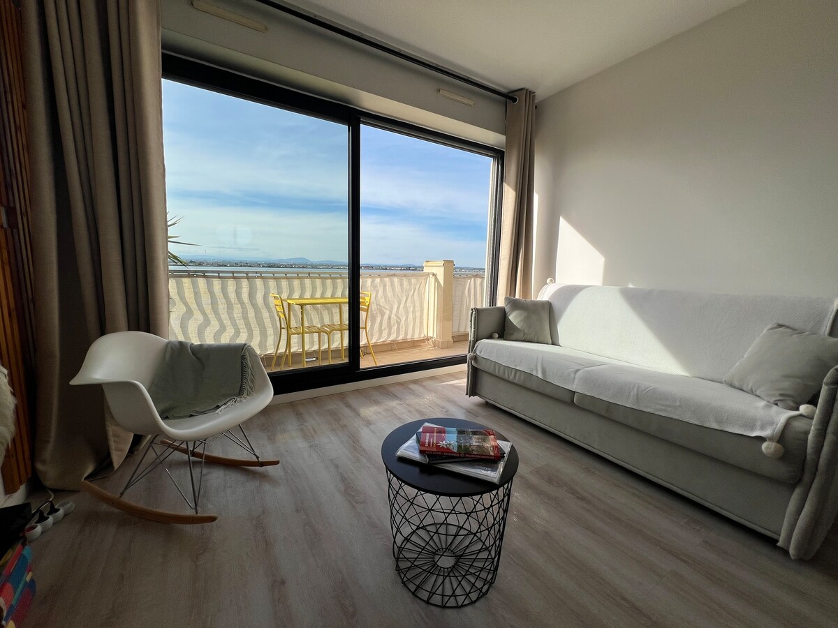 Studio ideally located, facing the sea, in the seaside resort of Palavas-les-Flots, - 10 min drive to Montpellier Exhibition Centre (Pérols) - 15 min drive to the highway exit, - 10 min drive to the airport The studio located on the 2nd floor of the residence with elevator is equipped with all the necessary comforts, reversible air conditioning, separate kitchen, TV, free enclosed parking within the residence... and has a sea view.