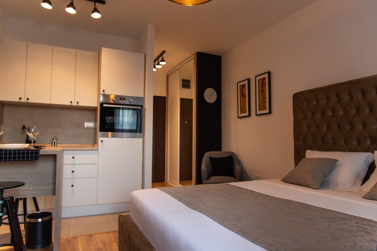 Enjoy your stay at brand-new studio in Podgorica! This cozy space features a convenient Murphy bed, a well-equipped kitchen, and a tranquil balcony for your relaxation. Enjoy the peace and comfort just a 5-minute walk away from the city center and 2 minutes walk to the main train and bus station. Perfect for a delightful stay in the heart of Podgorica!
