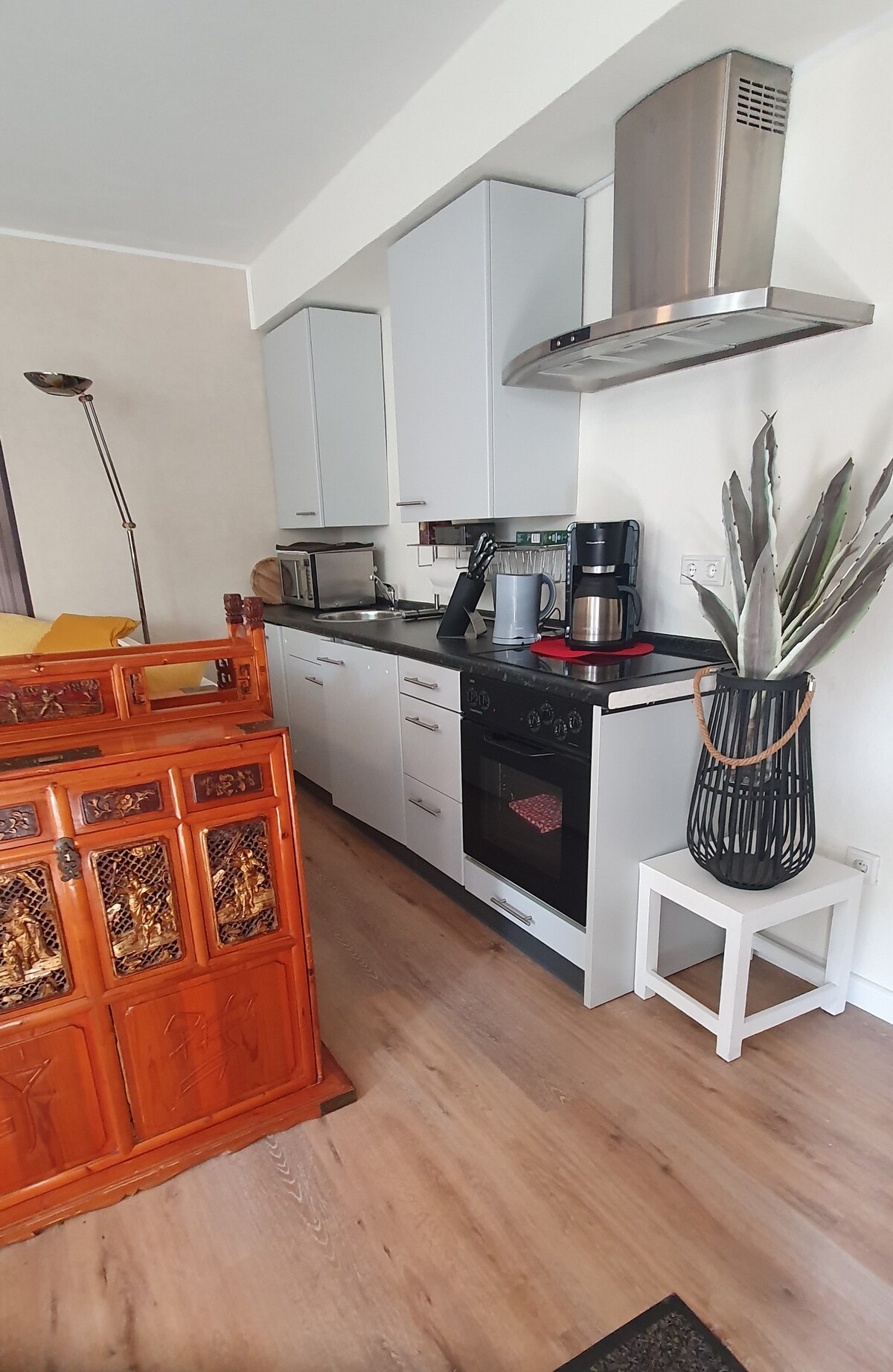 Cozy and lovingly furnished apartment in the countryside with wallbox. The 36 sqm apartment is located in a 2-family house in which we and a daughter with child live. The bathroom has a shower and toilet, as well as a washing machine and a laundry closet. The living room is connected to the sleeping area (a double bed), optically separated by a sideboard with a TV. The kitchen contains all kitchen appliances such as dishwasher, stove, microwave, coffee maker and other accessories.