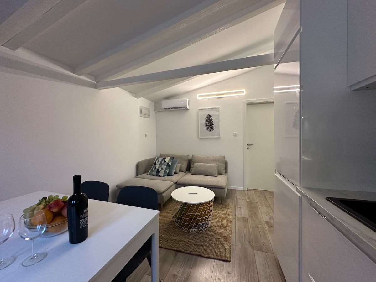 Apartman površine 60 m 2 sastoji se od spavaće sobe sa velikim bračnim krevetom, kupaone, prostrane dnevne sobe sa kuhinjom, predsoblja i balkona. Čitav južni zid prema moru je u staklu tako da prostor ima puno svjetla i sa balkonom čini jedan prostor. Apartman se nalazi na trećem katu kuće koja se nalazi u neposrednoj blizini centra grada (5 minuta ugodne šetnje uz more) te sa balkona ima otvoreni pogled na more i otoke budući se kuća nalazi u prvom redu uz more.