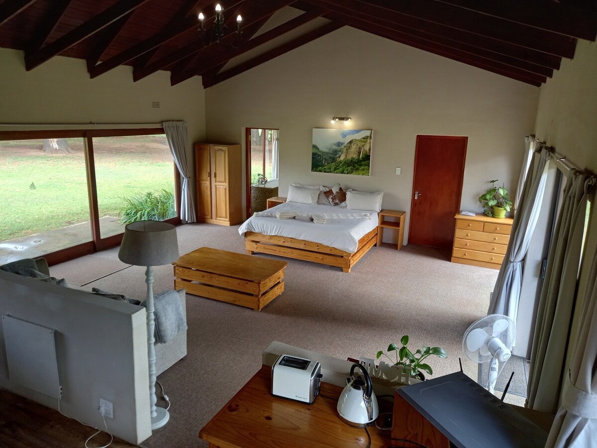 A hop, skip and a jump off the N3, situated in in the Van Reenen Eco Village Precinct. Down the road from the little church tea garden. A great one night stop off. Breakfast at the Tea Garden (not included) or take a early morning walk before continuing with your journey. Dinner can be booked in advance. No charge for children/elderly parent sleeping on lounge bed if accompanied by both parents.
