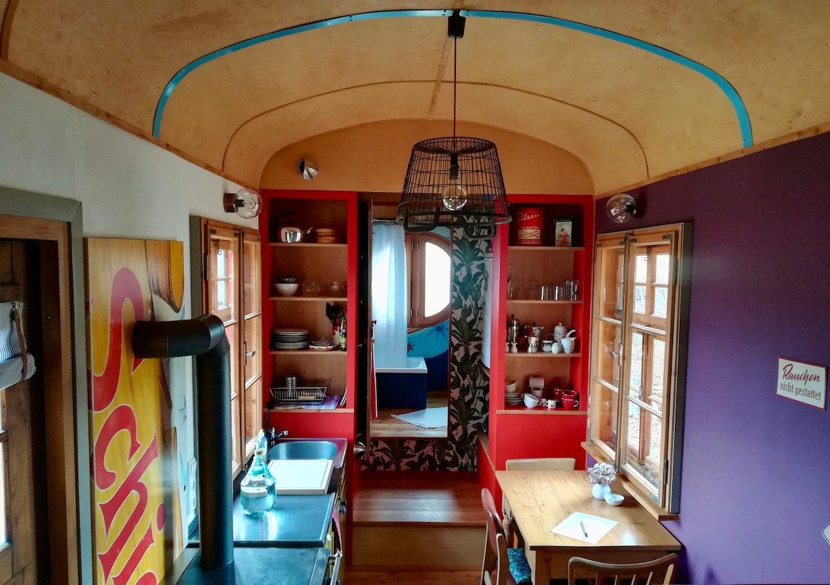 "Benno der Wagen" war ursprünglich mal eine alte Schießbude, die wir mit sehr viel Herzblut und Liebe für s Detail zum Tiny House umgebaut haben. In ihm kann man nun mitten in der Natur übernachten und sich dennoch wie zu Hause fühlen. Auf ca. 16 qm hat man alles, was man wirklich zum Leben braucht. Benno steht in der Nähe eines alleinstehenden Häuschens außerhalb von Kleintettau im Frankenwald. Auf einer Wiese am Waldrand sagt er dort Fuchs und Hase gute Nacht und freut sich über Gesellschaft!
