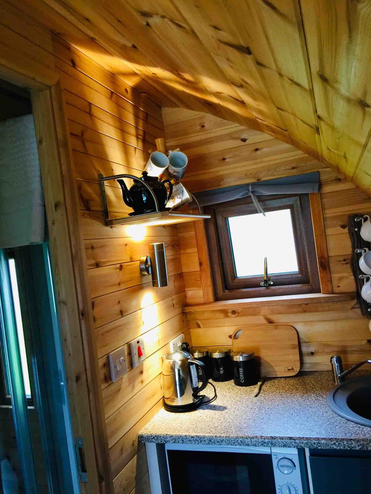 Self catering luxury glamping pod . A cosy private space nestled by the side of our cottage. It has a kitchenette with; Microwave Mini fridge & ice box Kettle Toaster Dolce Gusto coffee machine. Ensuite shower Double bed and a sofa. TV plays DVDs only , with a good selection of DVDs. There is no cooker in the pod but there is a Gas Plancha (Hot Plate) and a single gas ring situated in an outside cooking station next to the pod. WIFI