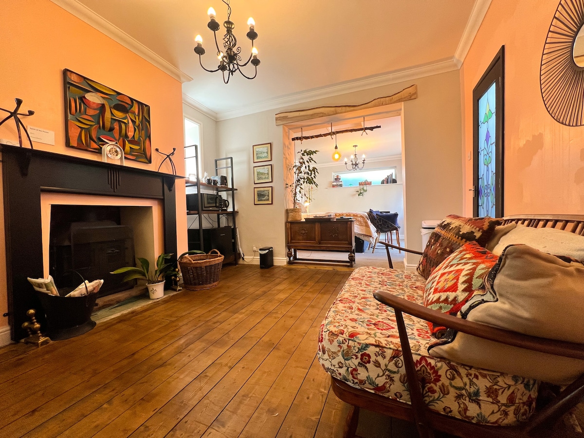 Only a 10 minute walk into town. Large room with king size bed, TV, workstation, armchairs and private bathroom on the first floor of my warm and artistic home. Close to pubs, shops and restaurants, railway station and arts cinema. You can use my garden, kitchen and dining areas. cooked breakfast is included. Sole use of upstairs, with extra double bedroom let exclusively to members of the same group sharing the upstairs bathroom, contact Jenny for availability and rate for the additional room