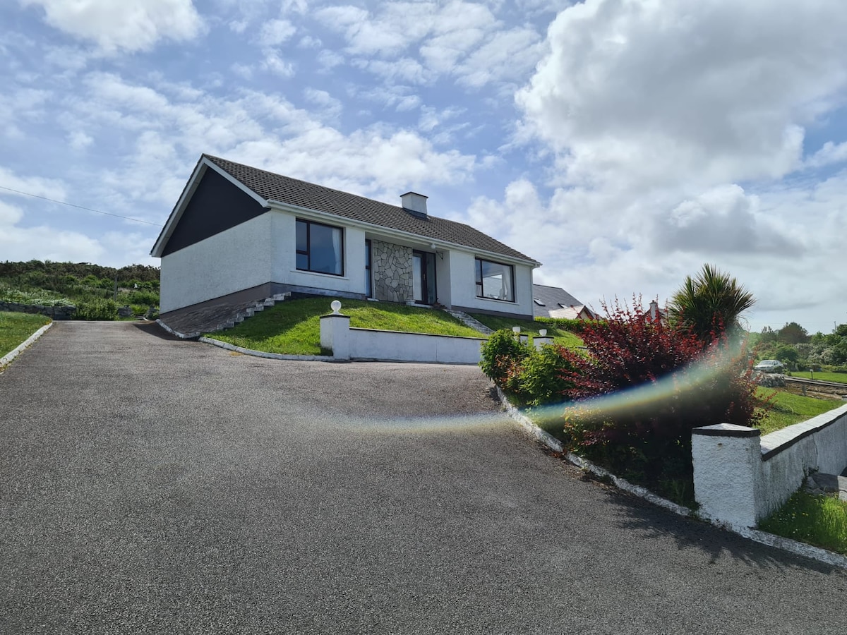 New MODERN holiday home on the shore of Tráighéanach Bay on the Wild Atlantic Way and just an 8 minute drive to the busy town of Dungloe - capital of the Rosses! DIRECT ACCESS to your very own PRIVATE shore area-perfect for open water swimming, kayaking, crab fishing , search for mussels or simply walk for miles when the tide is out! Wake up to the most spectacular sea view and breathe in the fresh sea air!