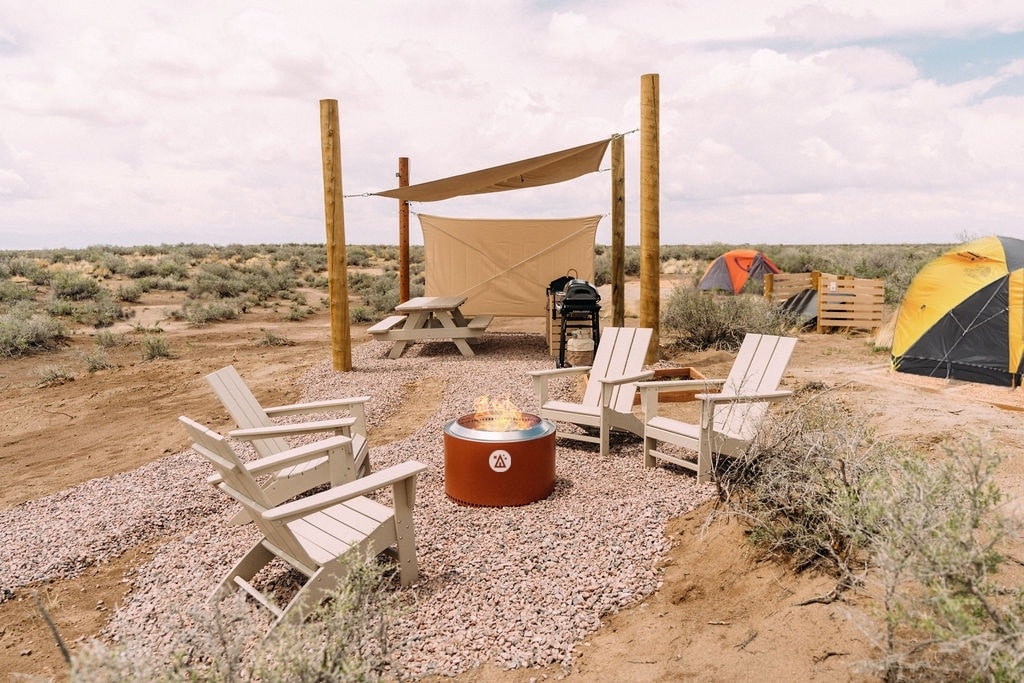 Enjoy 360° views of the desert beauty AND the comfort of a soft queen bed, hot water shower and personal charging station on our 320 acre off-grid property. ⛺️ Private tent sites 📍25 min from the Dunes, Zapata falls, Hot springs and more. You also get access to: • Shared Outdoor kitchen & dish sink • Blackstone grill & BBQ • Shared Indoor bathrooms (drive or walk) • Group & private campfires • Hammocks for stargazing WE ARE IN A DESERT So be prepared for desert weather!🏜️