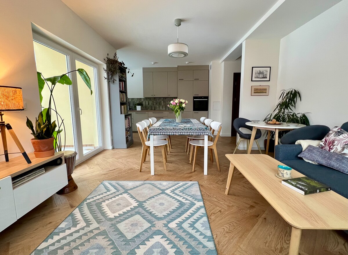 Admire how modern features blend harmoniously into a period apartment. A sunny front room overlooks a leafy neighborhood while houseplants and botanical prints continue the natural motif indoors. A cabinet displays a collection of elegant dinnerware. The apartment is near the city center of Wroclav. It's a 10 minutes by tram or 25 minutes walk to the centre (Arkady)Although a tram stop is close by, this is an incredibly quiet and peaceful place. Some quirky local cafes are just around the corner
