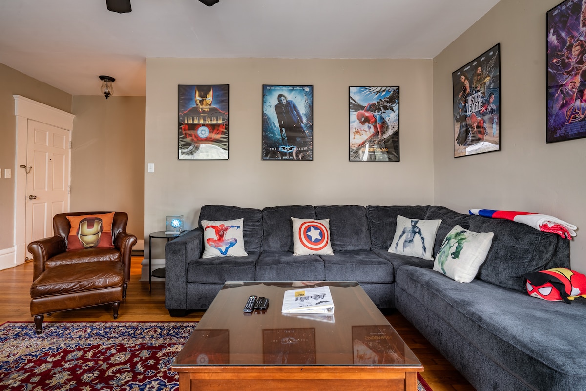 Step through the door and into a comic! Our uniquely decked-out home near Bexley is a visual adventure, full of framed comics, eclectic posters, and playful decor. It is nestled just a hop from East Market, the Franklin Park Conservatory or a quick dash to downtown. Perfect for super-teams or hero families, it features spots for remote work, and an outdoor fire pit and sleeps six caped crusaders or eight with our secret day bed and trundles. Book a stay where every corner tells a story!