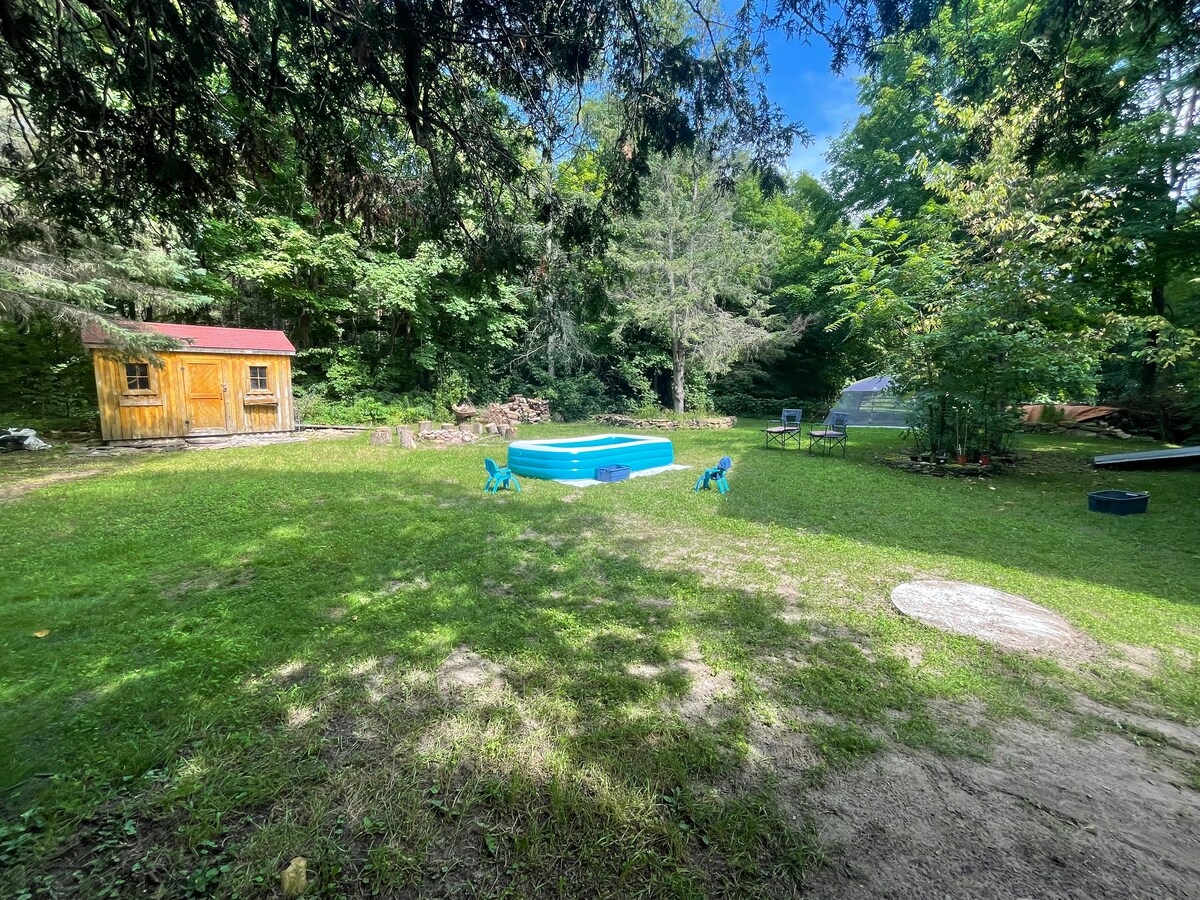 1 hour 🚗 ride from downtown Montreal and Ottawa! Welcome to The Crimson Cabin Room! Curl up by a crackling outdoor campfire or indoor fireplace, dream in a plush bed, and make memories in the retro red kitchen filled with charm. Play games, read beloved books, or dine/watch movies from a dreamy tent overlooking the forest. With warm touches everywhere, it’s a fairytale escape wrapped in comfort. The Crimson Cabin isn’t just a place to stay—it’s where enchanted magic comes to life!