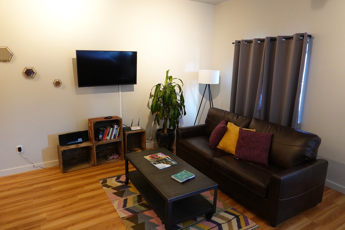 This sweet apartment is centrally located between Kuna and the interstate. The apartment is located on the owners property and is completely separate. It has a nice gazebo/patio area and one parking space. Two queen size beds, one comfortable couch. Barstools and an eating bar. Minimal kitchen with Keurig and a coffee pot, coffee Fixin‘s, toaster, microwave, hot plate, blender bullet, small crockpot and refrigerator. There is a washer and dryer if requested.