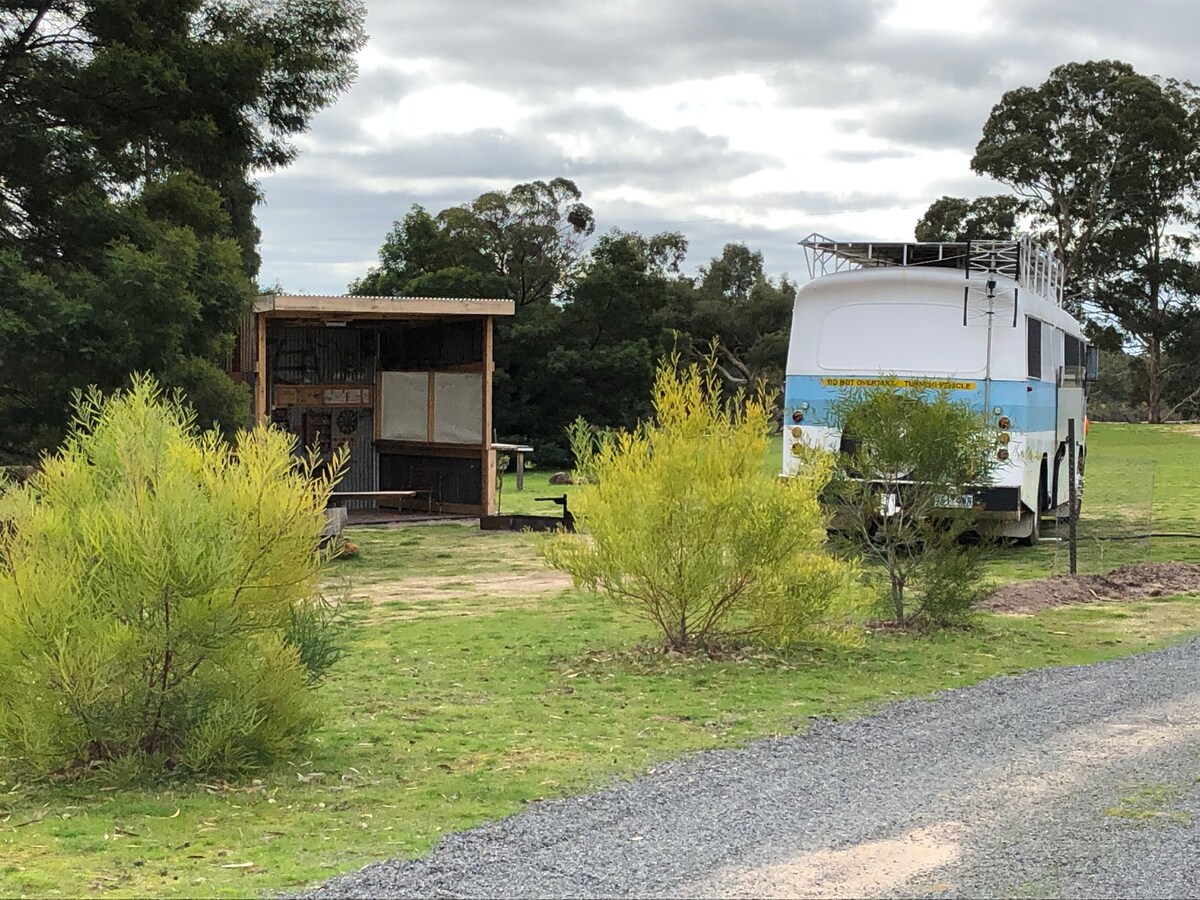 Enjoy the nature of Bellbrae when you stay in this unique place. A fully self contained bus home, offering privacy and comfort. The perfect stay for a couple, equipt with a simple kitchen, bathroom, queen sized bedroom and lounge area. The outdoor area has a table and chairs, also a BBQ if desired. It opens onto a shared open area of green grass and trees. Only 5 minutes drive from Torquay, Bells Beach, Point Addis and Jan Juc. Come and experience what it's like to live on a deluxe bus!
