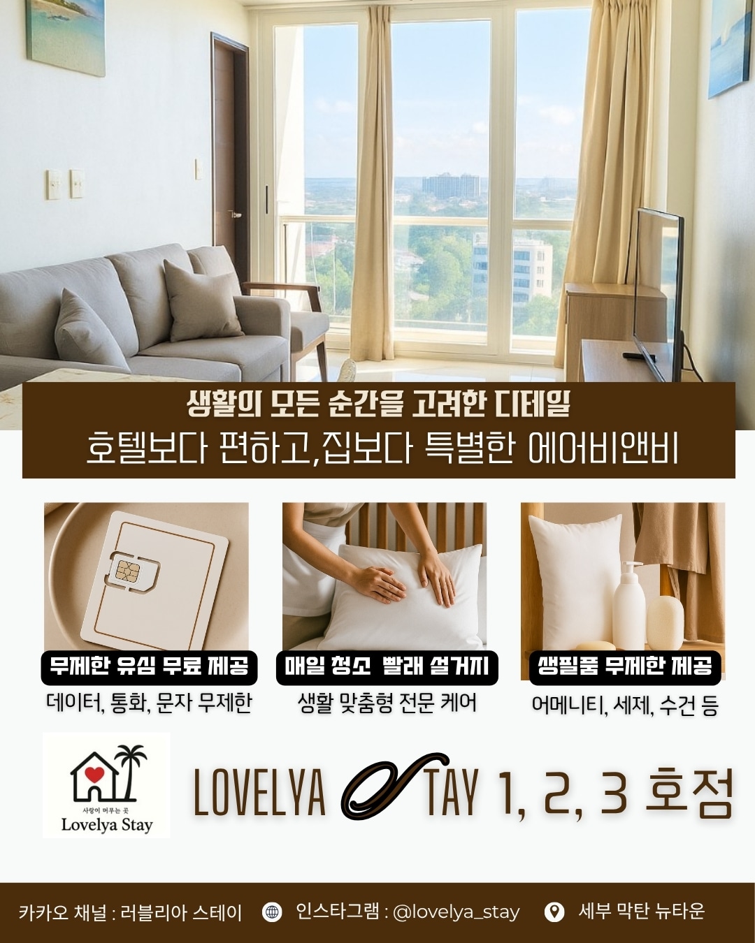 러블리아 스테이는 같은 컨디션, 같은 서비스를 제공하는 1, 2, 3호점이 있습니다. 호스트의 다른 숙소 확인을 통해 상세 정보를 확인 하실 수 있습니다 :) ㅋㅏㅋㅏ오 채널 : 러블리아스테이 사랑이 머무는 곳, Lovelya Stay No.1 🤍 🤍 탁 트인 씨뷰와 함께 시작되는 하루. 🤍 생활의 모든 순간을 고려한 디테일. 🤍 ‘호텔보다 편안하고, 집보다 특별한’ 휴식처. 🤍 막탄에서 가장 쾌적한 뉴타운에서, 깔끔하게 정돈된 세부를 만나보세요 - 오래 머물고 싶은 공간 Lovelya Stay. 당신의 세부 여행에서 가장 편안했던 공간으로 기억되길 바랍니다. - 💕 세부 라푸라푸시 막탄 뉴타운(Mactan Newtown, Lapu-Lapu City, Cebu) ➖➖➖➖➖➖➖➖➖➖➖➖➖➖➖