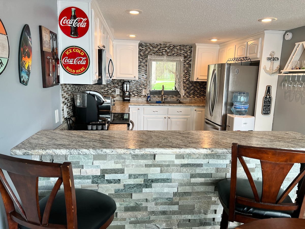 Welcome to our Wissota Sanctuary! Newly renovated, our 2-bedroom 1-bunkroom haven sleeps 6, with a gourmet kitchen, cozy living room, and stunning lake views. Enjoy direct water access, stunning sunsets, outdoor decks, 3 smart TVs, and a stocked fire pit. Nearby, explore Wissota State Park, bike Old Abe State Trail, or tour the iconic Leinenkugel's Brewery. With high-speed wifi and keyless entry, your stay promises comfort and convenience. Book now for an unforgettable lakeside getaway!