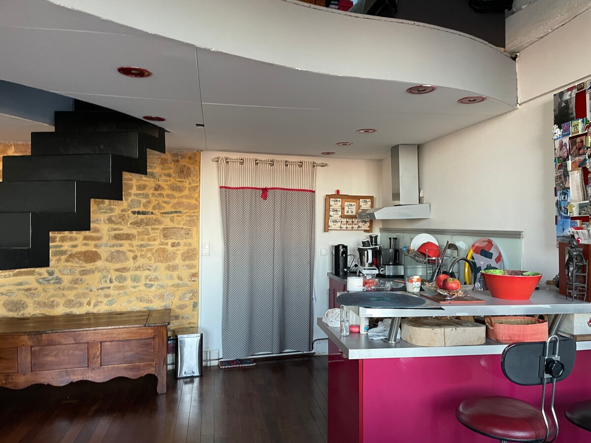 🌿 Feng Shui retreat with private hot tub – Exceptional chateau in Brindas Stay in a unique, timeless setting, nestled in a former castle in the heart of the village of Brindas, just 15 km from the center of Lyon. This unique triplex has been designed according to the principles of Feng Shui to promote relaxation, harmony, and rejuvenation.