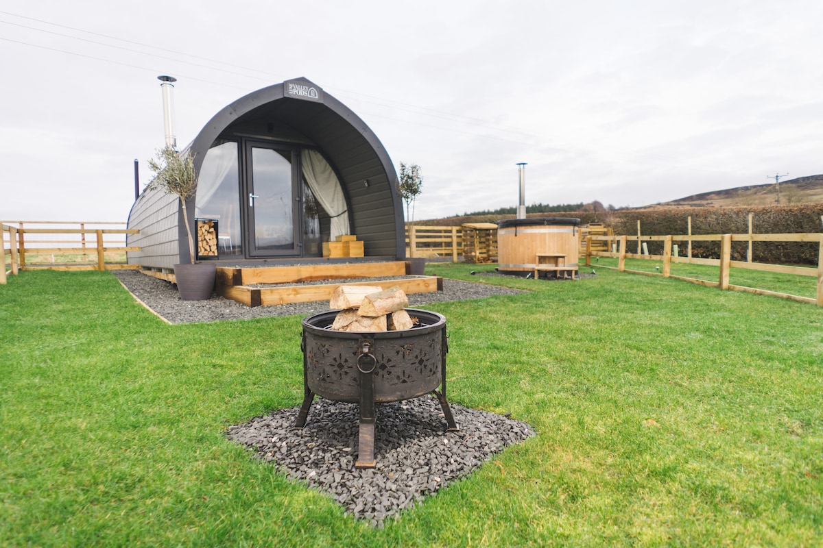 This stylish Pod is perfectly positioned above Edlingham Vale, with the Simonside hills beyond. Deep in the heart of North Northumberland, amenities in Alnwick and activities are just a 10 minute drive away. Next to the Pod, there is parking for 2 cars. Our Pod overlooks the hilltop Farm Steading of Overthwarts, giving panoramic views of the countryside. With your own private gated entrance, you can come and go as you please or enjoy the views from the comfort of the wood fired Kirami hot tub.